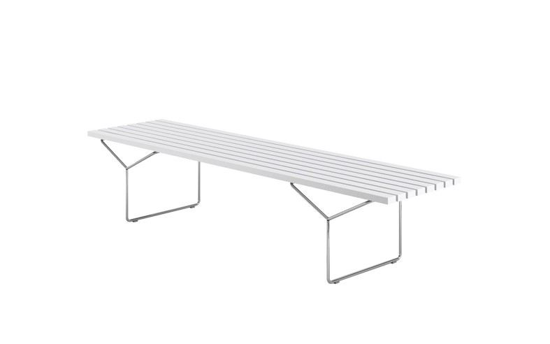 Le banc BERTOIA en fil d’acier soudé traité époxy a été créée en 1952. C’est une icône de design récompensé par de nombreux prix. Le traitement époxy de sa structure lui confère une très grande résistance aux chocs et aux rayures. Les lattes d’assise sont en résine minérale blanc pour un usage extérieur. Le logo KNOLL est gravé sur le piétement du banc.