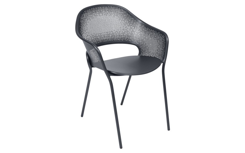 Le fauteuil Kate dessiné par Patrick Jouin est conçu avec une structure acier et un dossier coque perforée en acier. Pour améliorer son confort une galette d'assise grise peut être commandée en option. Le fauteuil Kate est disponible dans les 24 coloris du nuancier Fermob. Empilable par 4.