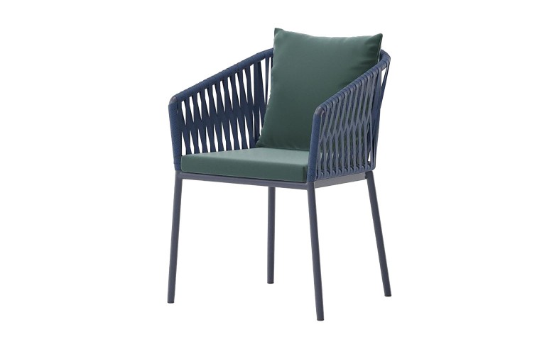 Le fauteuil repas Bitta est conçu avec une structure en aluminium recouvert pour l'assise d'un tressage en cordes Bela Rope. 2 versions de ce fauteuil sont disponibles avec le tressage uniquement sur l'assise, ou le tressage intégral sur l'assise et le piétement. Pour que son confort soit optimal le coussin de dos est intégré, en plus du coussin d'assise.