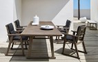 La chaise repas GIO est proposée avec un coussin unique d'assise et de dossier complètement déhoussable. La structure est en Teck massif grisé et stabilisé, l'assise et le dossier sont composés de sangles coloris tortora. Il est conseillé de protéger le mobilier par une housse de protection imperméable pendant la période hivernale.