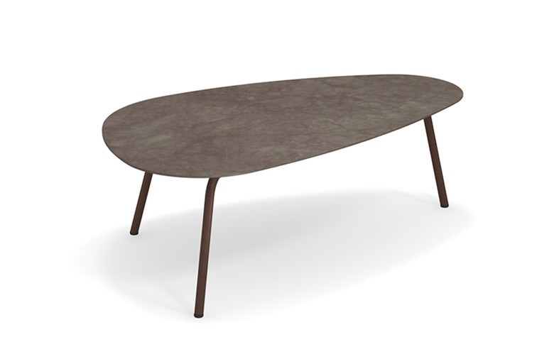 Les tables basses Terramare sont réalisées en aluminium verni. 5 coloris de piétement sont proposés : blanc mat, noir mat, vert de gris, marron d'Inde, ou corten et 3 coloris pour le plateau en grès porcelainé : blanc statuario, noir basaltina ou bronze Emperador.